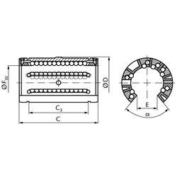Self-aligning linear bearings series 3 of ISO standard 10285 from premium brand in top quality. High load-bearing capacity, due to the asymmetric position of the rows of balls and the specially shaped raceway segments. These linear bearings can be fitted inside a closed or open housing and are thus adjustable. With wiping double-lip seals. These bearings are self-aligning up to +/- 0,5°. Bearings with FW 5mm must be lubricated before use. All other bearings are lubricated ready-to-install. Recommended shaft tolerance h6, housing tolerance H6. Stainless version on request.
