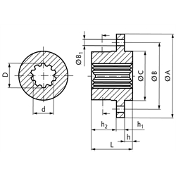 As connecting element for torque transmission and centring. Easy sliding fit with our toothed shafts profile DIN 5480. The positon of the bore holes does not refer