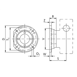 Material: Aluminium. Round flange with fixing screws for retrofitting, for geared motor HMD/II. Ordering Details: e.g.: Product No. 439 044 00, Output-Side Flange, Ø 140 mm.