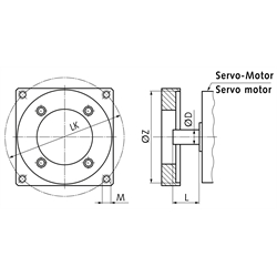 Mounting flange and backlash-free compensating coupling in clamp style (without keyway) with Shore hardness 64°D for mounting a motor to the servo worm gearbox ZM/S. A selection of flanges and ready-to-install couplings for various motor sizes and shaft diameters is listed for each gearbox size. The four fastening screws for mounting the flange to the gearbox are included in the scope of delivery. Other dimensions on request.