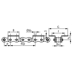 According to DIN ISO 606 (ex DIN 8187). Attachment distance 4 x p (attachment at every second outer link). Other attachment distances can be supplied at short notice. Different attachment sizes and special chains on request. Connecting links 11/E have to be ordered separately. * The marked dimensions are not listed in the DIN.