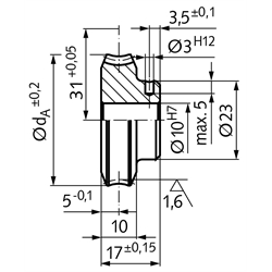 Material: Brass CuZn37Mn3Al2Si. Pressure angle 15°. The gear wheels can only be used with worms having the same centre distance and the same transmission. * Worm only polished - worm gear with helical gearing. ** The figures stated for the efficiency are only reference values, since - besides the lead angle - also mounting, lubrication, speed and assembly have an influence on the efficiency.