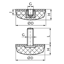 * Fperm. is the permissible static permanent load, which may be overlaid by a dynamic, alternating load. With shearing load please take care that no tension load in the rubber occurs at all during mounting. To achieve a sufficient fatigue strength provide some compressive pre-stressing. The stated permissible loads are only approximate, guideline values for the static load for "medium" rubber hardness. With particularly high, dynamic, alternating loads or high frequencies, the load figures have to be reduced accordingly. Temperature resistant up to 80°C.