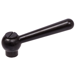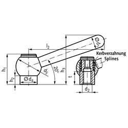 Material: Steel, black oxide finish. Version N = handle slanted, with metric thread. Adjustable clamping levers are used in applications where either the clamping range is limited or where a specific lever position is required. The serrated bore in the spherical hub is fitted with a threaded-bolt insert, which engages in the hub with its own serrations. By depressing the clamping lever, the serrations are disengaged, freeing it for re-positioning in the most convenient position. When releasing the lever, the serrations re-engage automatically. Should a rotation of 360º not be possible, the insert can be slightly screwed in (after the lever has been disengaged) by means of the slotted knurled screw.