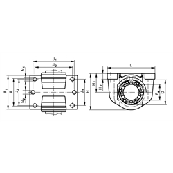 Material: Aluminium die-cast. Light housing for linear bearings of closed design, ISO Series 3 (linear bearing has to be ordered separately). The housings can be mounted standing, upside-down or horizontally. The bearing is secured in the housing against axial and radial movement with a grease nipple.