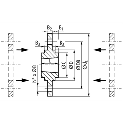 Hub for fixing a chain plate wheel or similar parts with a low priced taper bush onto a shaft. The wheel must get a center hole Ø D (recommended tolerance: H8) and bores for mounting bolts. It can be mounted on the right side or left side. The bolt length depends on the wheel width. Bolts and nuts are not included. The wheel and the taper bush have to be ordered separately.