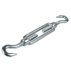 Turnbuckle DIN 1480, with 2 hook screws. One side right-hand thread, other side left-hand thread.
