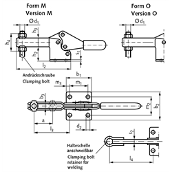 Material: Steel-sheet parts: Case-hardened steel C10, zinc-plated. Bearing pins: hardened, from size 350 case hardened. All moving parts lubricated with special grease. Handle with plastic sleeve, red, oil resistant. Note: A special feature of the horizontal clamp is its low profile in the clamping position.They are designed to avoid the operator's fingers being caught between the retracting clamping arm and the operating handle (safety distance). During the closing movement it is guided on both sides to prevent it from being affected by possible side thrusts. Version M: forked clamping arm. Version O: solid clamping arm. Attention: The clamping bolts and protective cap have to be ordered sperately. * Size 25 only available in version M.