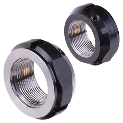 Reusable shaft nut with integrated locking devices. Special features of the shaft nut are the locking inserts from brass. These inserts are threaded and thus does not cause any damage. The locking inserts are pressed against the shaft thread with locking screws. With the screws, the runout can also be adjusted up 0.005 mm. Up to size 15 with two additional wrench flats. KMT-Locknuts are designed for applications, which require a high precision and trustable locking.