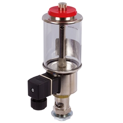 Material: Brass nickel-plated. Cylinder made from acrylic glass. Voltage: On choice: 230V AC, 50Hz, or 24V DC. Drip rate normal: about 45 drops per 1 ml. Other than the manual drip-feed oiler, which also drips when the machine has stopped, the electric drip-feed oiler only drips as long as the machine is running. When the machine stops, the electric drip-feed oiler is also automatically shut off, as the oiler is controlled via the machine programme. Finest dosing of drops is possible - by turning a knurled nut at the top part of the oiler. Almost all liquids can be dosed drop by drop, provided they are not mixed with solid matters. It is also suited for other media, provided they do not thicken with heat. Attention must be paid to the compatibility with acrylic glass and buna N used as sealing material. (possibly natural glass and vitone sealings on request). Duty cycle: intermittent 20%. Protection class acc. to EN 60529: IP20. Power consumption: 12VA (12W).
