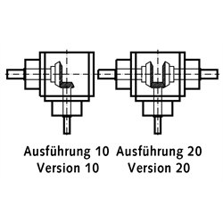 General data: 3 Designs, 6 standard version, and many further variations available as multi-shaft gearboxes, please enquire. Also available in corrosion-proof and NO-TOX version for the food processing and pharmaceutic industry. Housing: Thick-walled grey cast iron, fully sealed against oil leaks and protected against dust. Due to the cube shape, all 6 sides of the gear box can be used as mounting surfaces. The diameters l1 and l2 are provided for use as alignment studs. Gearing: Hardened bevel gears, lapped in pairs Special transmission ratios available on request. Bearing System: Generously dimensioned roller bearings, rein- forced bearings on request. Lubrication: The gearboxes are fully enclosed, lubricated for life and maintenance free. On request, the gearboxes can also be supplied with oil change lubrication or NO-TOX lubrication for the food industry. If the gearbox is used at higher speeds (see table) venting must be provided. For this purpose, please state the mounting position (downward-facing side) and operating time. Model K: Input side A: Ratio for gearing up. Input side C: Transmission ratio for gearing down.
