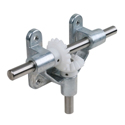 Two shafts with two bevel gears. On the long, straight-through shaft, the bevel gear is at the left side, refered to the short shaft. The shaft for the power input and it´s sense of rotation can be chosen freely.