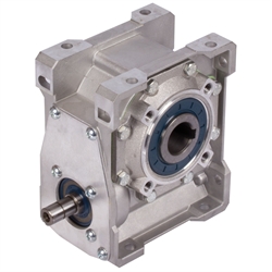 Housing: Aluminium die-cast, with connecting threads on both input and output sides. With mounting holes on all other sides. Worm shaft: hardened and ground. Worm Gear: Bronze, on cast iron hub. Lubrication: synthetic oil (lubricated for life). Lightweight, high quality model range, 5 sizes, centre distance 31.5, 40, 50, 63 and 75 mm. Size 90 and 110 on request. The gearboxes can be used without ventilation and independent from the mounting position. Output shaft push-in type: The basic gearbox version has a hollow shaft. They can, however, also be supplied with a push in type output shaft (single sided, to be used left and right, or double sided). These output shafts have their own product No. and have to be ordered separately.