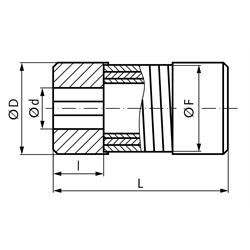 Material: Hub 1.4305 (AISI 303). Spring: Spring steel 1.4310. These couplings are elastic all-metal couplings and completely maintenance free. The all-metal design leads to a strong resistance against oil and higher temperature range: -40°C to +300°C. The elastic part consists of a spring body, made up of three layers of wound springs. The couplings are suitable for both rotating directions. They can be locked against rotation with a feather key or with pins. The couplings are pressfitted. Demounting is done by pressing or pulling off. Vibrations and shocks are largely absorbed. Depending on the length of the coupling - S, L or Db - bending of 3 - 6° or axial displacement of 3 - 6% of the nominal shaft diametre are possible. Couplings are available pre-drilled ex stock. Customized bores and feather-key grooves available at surcharge.