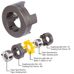 Two coupling hubs combined with one spider and two taper bushes make up a ready-to-install elastic coupling.