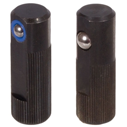 Material: Version A: Free cutting steel, black oxide finish. Ball: Stainless steel, hardened. Spring: Stainless steel. Temperature range -30°C to +50°C. Version B: Free cutting steel, burnished. Ball: Steel, hardened. Spring: Plastic. Temperature range -40°C to +80°C.